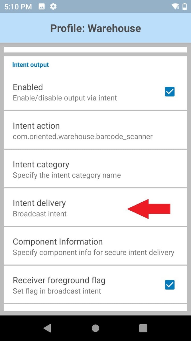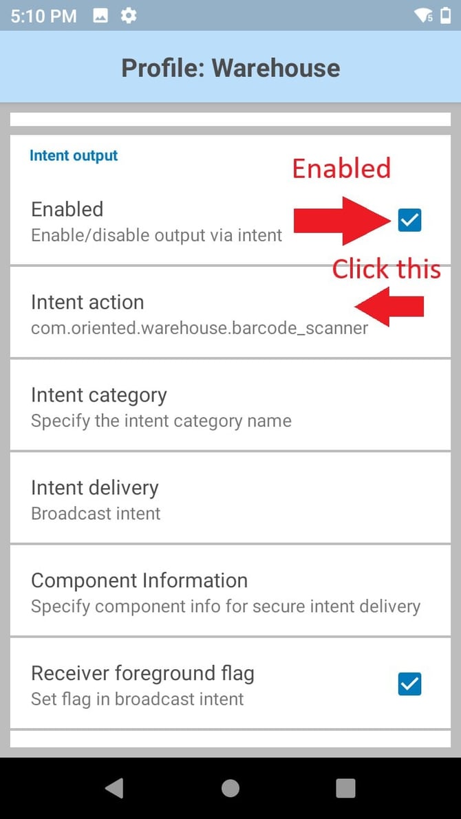 13.2. In the designated 'Enter intent action name' field, input the following name exactly as shown: com.oriented.warehouse.barcode_scanner