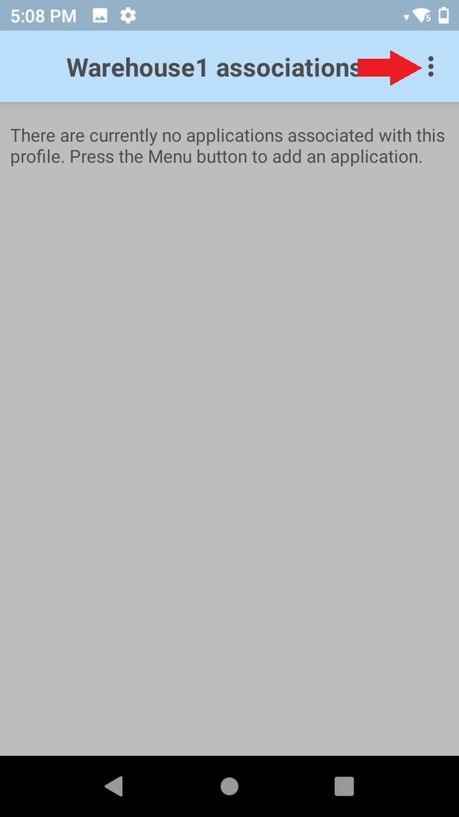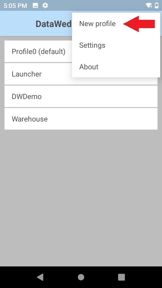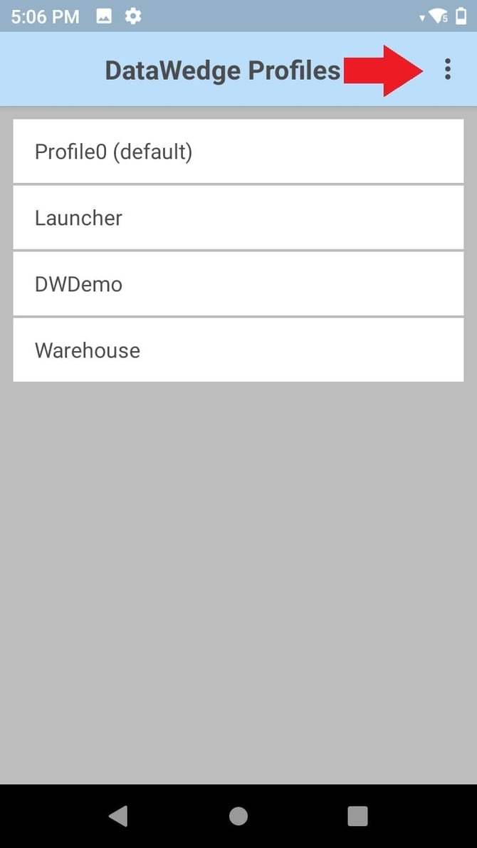 2. On a new installation, the DataWedge Profiles screen appears similar to that of the image below, showing the visible Profiles. White text indicates enabled Profiles. Tap the three-dot menu.