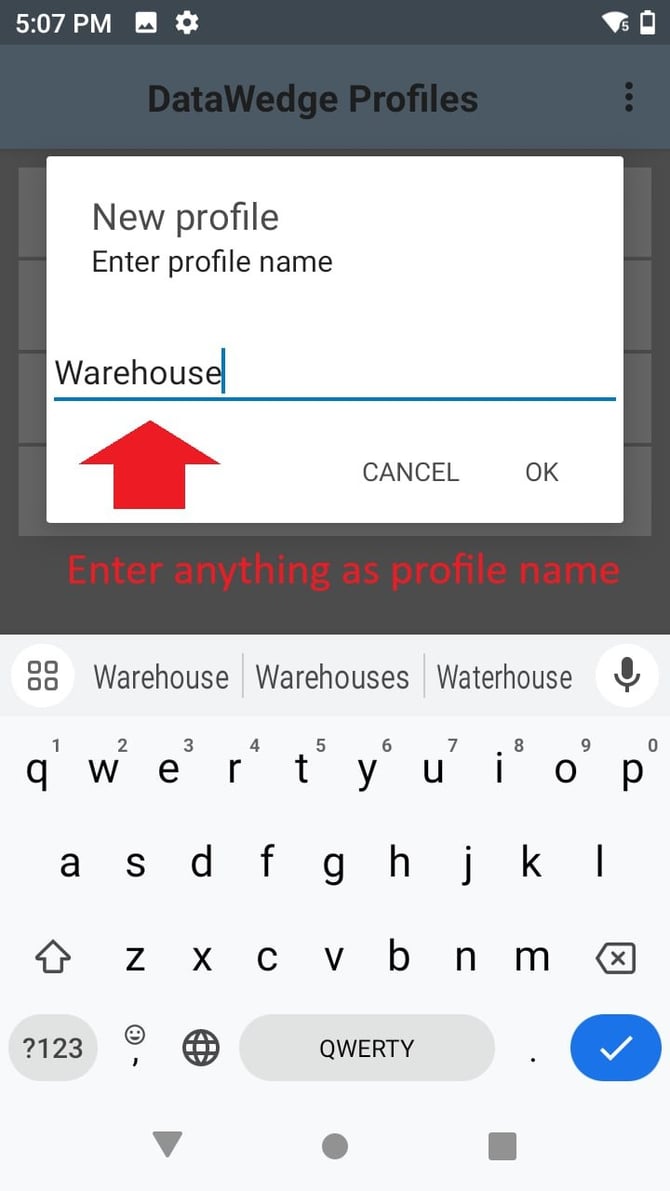 4. In the designated 'Enter profile name' field, input your preferred profile name, such as 'Warehouse', and tap 'OK'. To cancel, tap 'Cancel'. The Profiles list appears, similar to the image in Step 2.
